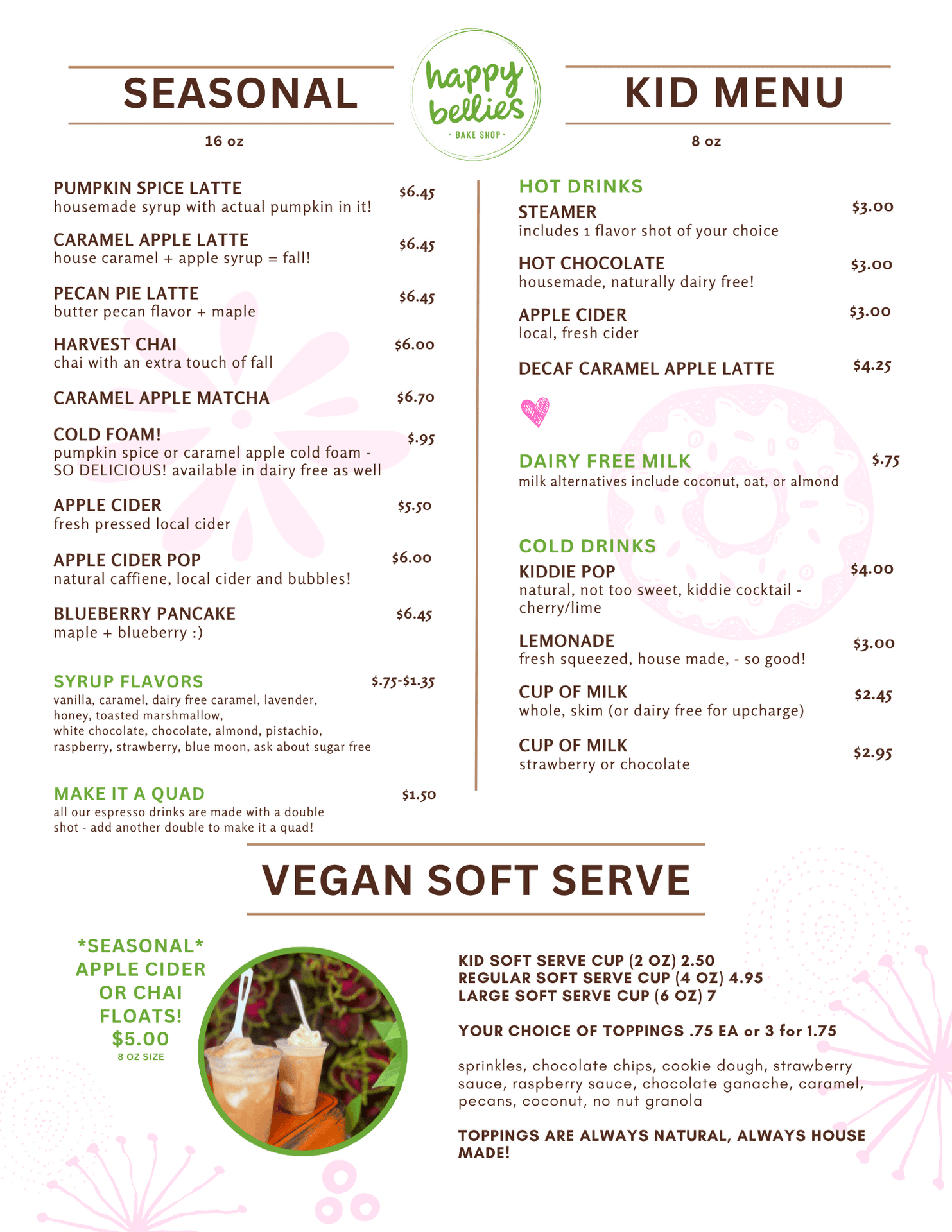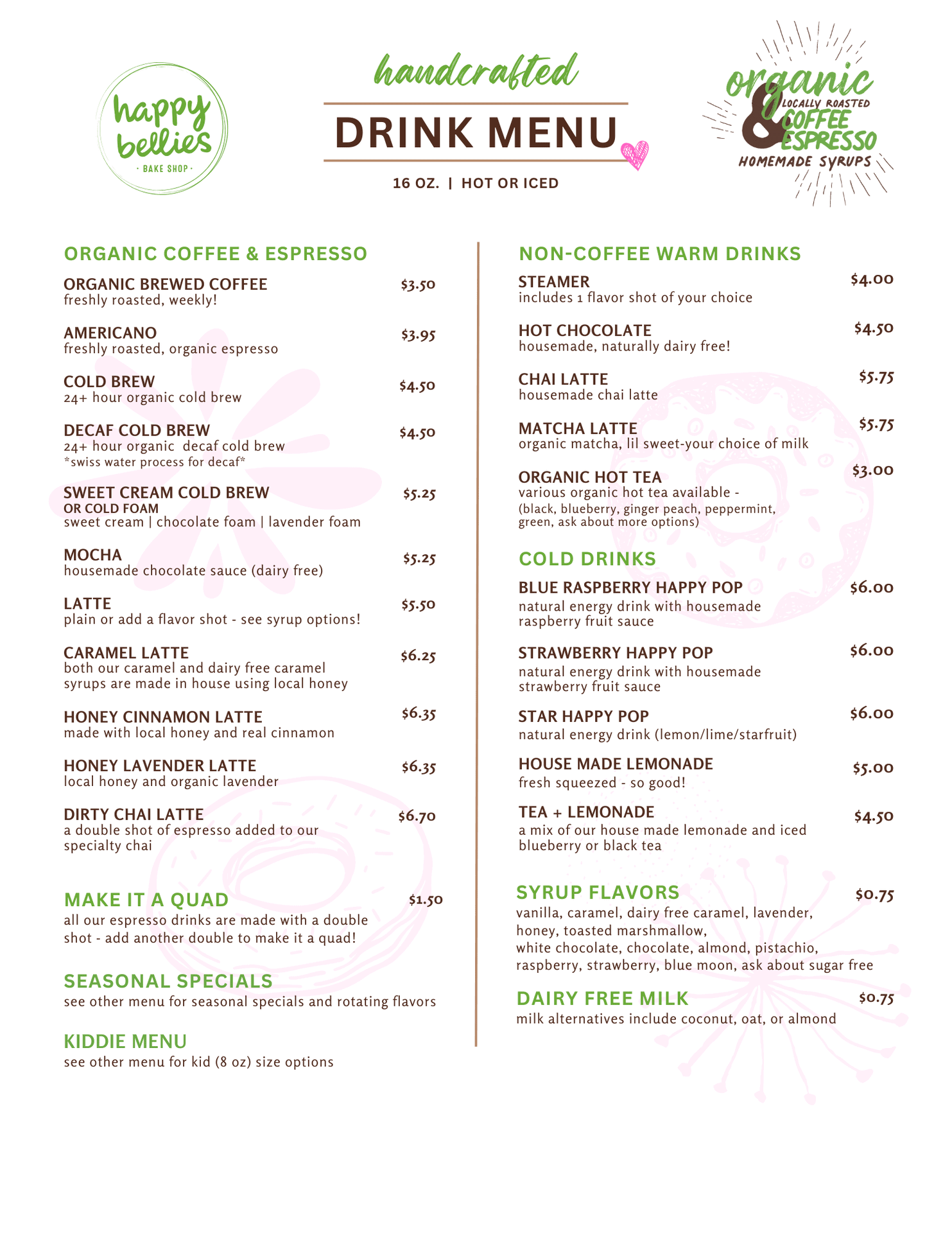 Absolutely! We have decaf options, chais, teas, steamers, and seasonal favorites like hot chocolate, lemonade, and happy pops! The littlest family members love many of our drinks as well – our 8 oz. size especially for them makes for some very happy kids!